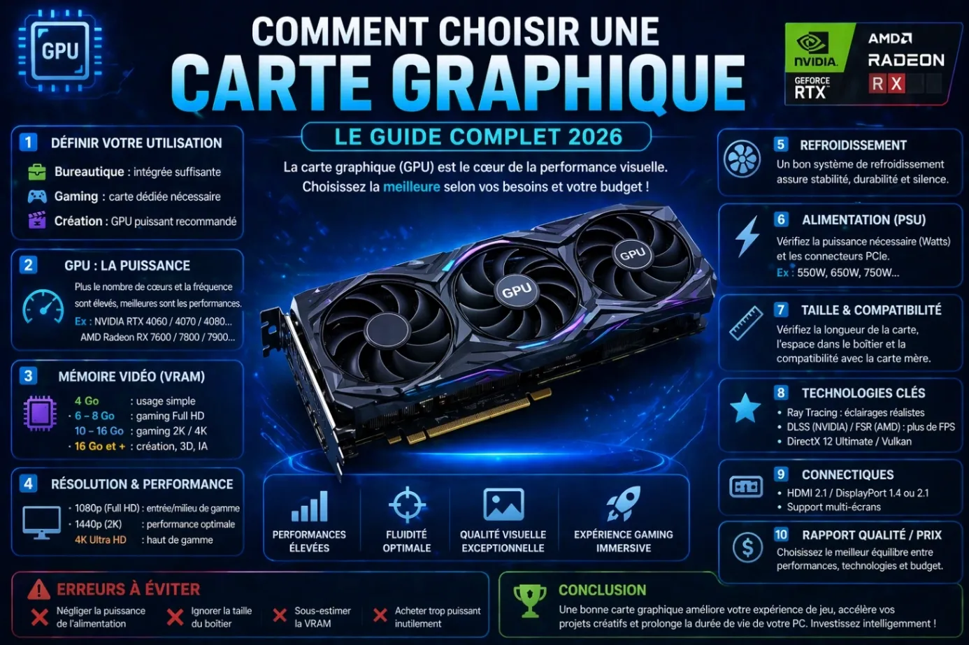 La carte graphique est essentielle pour un PC performant. Pour bien choisir, analysez votre usage, la VRAM, la compatibilité et les technologies.
